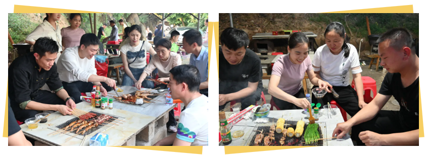 烧烤区同样热闹非凡。火焰舔着烤肉的表面,发出“嘶嘶”的声响,香气四溢,引得众人纷纷围拢过来。大家一边烤着肉一边分享着烧烤的小窍门,气氛融洽而欢乐。