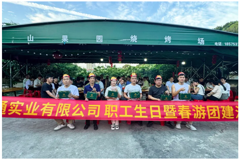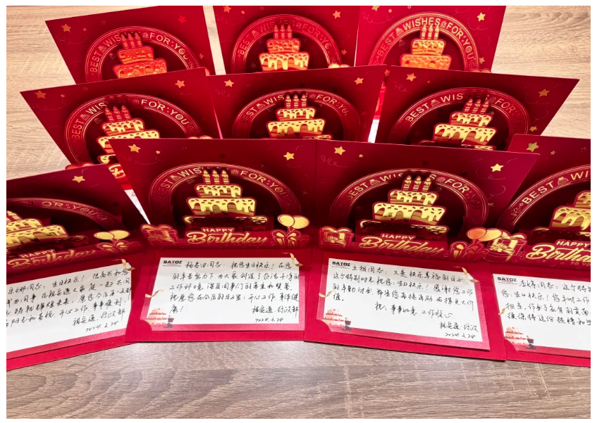 用餐前,行政部为参加活动的员工们表示了感谢,并对现场付出的人表达了敬意。随后,进入了生日祝福环节。孙总为他们颁发了精心准备的生日礼品以及他亲手书写的生日祝福贺卡。这份独特的礼物让寿星们深切感受到了公司对他们的关怀与祝福。