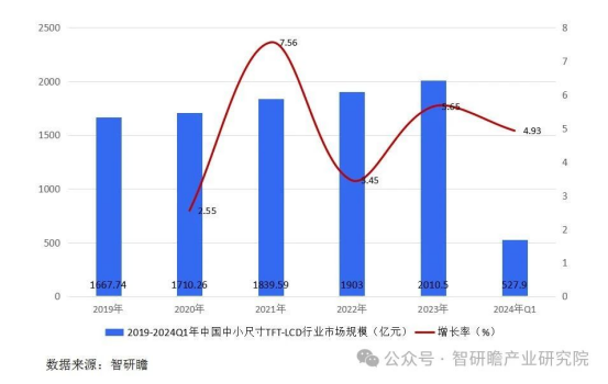 中小尺寸tft-lcd的上游产业主要涉及玻璃形成物、抛光材料等关键材料的供应,这些材料对于面板的生产质量和性能至关重要。在应用行业方面,中小尺寸tft-lcd广泛应用于多个领域,主要包括移动设备、消费电子、医疗设备、工业控制和汽车显示等。移动设备领域包括智能手机、平板电脑和可穿戴设备,中小尺寸tft-lcd以其高分辨率、对比度和色彩饱和度提供出色的视觉效果和用户体验。消费电子领域如笔记本电脑、电视和游戏机等也受益于中小尺寸tft-lcd技术,满足人们对高质量图像和视频的需求。医疗设备领域则利用中小尺寸tft-lcd的高分辨率和优良色彩再现能力,为医生和患者提供准确的图像和信息显示,提高医疗诊断和治疗的效果。此外,工业控制和汽车显示等领域也对中小尺寸tft-lcd有着不断增长的需求。我国中小尺寸tft-lcd行业市场规模和增长率在2022年,中国的中小尺寸薄膜晶体管液晶显示器(tft-lcd)市场达到了显著的规模,总计市值高达1903.3亿元人民币。在这一市场地理分布上,华南地区以34.6%的份额位居首位,显示出其在行业中的重要地位。紧随其后的是华东地区,以21.65%的市场份额贡献了相当一部分行业比重。在产量方面,中国中小尺寸tft-lcd行业的生产能力在2022年达到了约1913.5万平方米的水平,展现了该行业在供应方面的强大能力。与此同时,需求量也表现不俗,约为1197.23万平方米,揭示了市场对于中小尺寸tft-lcd产品的旺盛需求。我国中小尺寸tft-lcd行业的头部企业包括京东方、华星光电和群创等,这些企业在市场中占据领先地位,具备显著的产能优势和技术实力。京东方科技(boe)作为全球领先的半导体显示技术、产品和服务供应商,在tft-lcd领域拥有深厚的技术积累和广泛的市场影响力,同时在oled等新型显示技术领域也持续拓展。华星光电技术(tcl华星)专注于液晶显示面板的研发与生产,其产品广泛应用于电视、手机、平板电脑等消费电子产品,展现出强大的市场竞争力。群创光电(群创)作为台湾鸿海集团旗下的显示技术公司,凭借其强大的研发和生产能力,在中小尺寸tft-lcd市场中占据重要位置。此外,天马微电子作为液晶显示器(lcd)及液晶显示模块(lcm)的专业设计企业,主要服务于车载、医疗、工控等领域,凭借其专业技术和市场应用经验,赢得了市场的广泛认可。据智研瞻统计显示,2019年中国中小尺寸tft-lcd行业市场规模1667.74亿元,2024年q1中国中小尺寸tft-lcd行业市场规模527.9亿元,同比增长4.93%。2019-2024q1年中国中小尺寸tft-lcd行业市场规模如下: