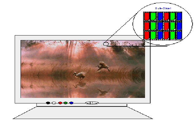 彩色滤光膜的各像素对应液晶屏的各像素,每像素包含红、绿、蓝三个子像素,光线透过彩色滤光膜形成红、绿、蓝三基色分量,如图上所示。